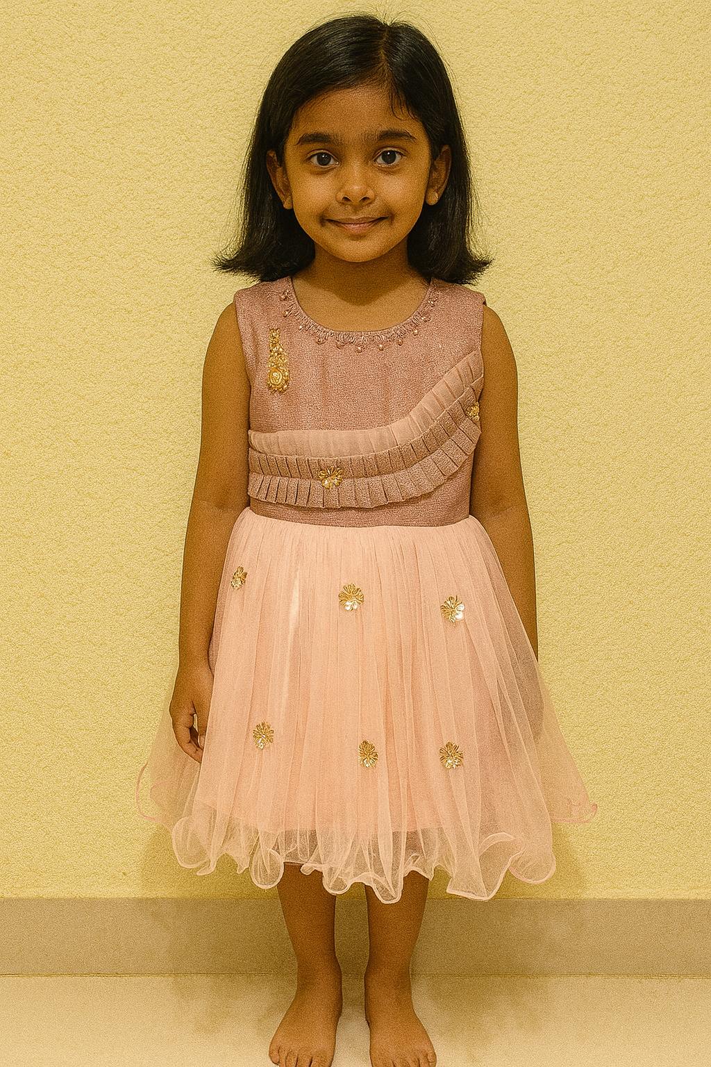 নরম ও হালকা ফেব্রিক গ্লিটারযুক্ত পিঙ্ক টপ বুকের অংশে প্লিটেড ডিজাইন ও গোল্ডেন ডিটেইলস স্কার্ট অংশে নেট লেয়ার ও ফুলেল এমব্রয়ডারি স্লিভলেস ডিজাইন জন্মদিন, পার্টি, ঈদ...